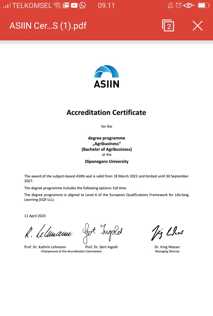 CONGROTULATION FOR INTERNATIONAL ACCREDITATION OF ASIIN ASIIN Certificate Semarang UNDIP Ba Agribisnis 2023-03-24